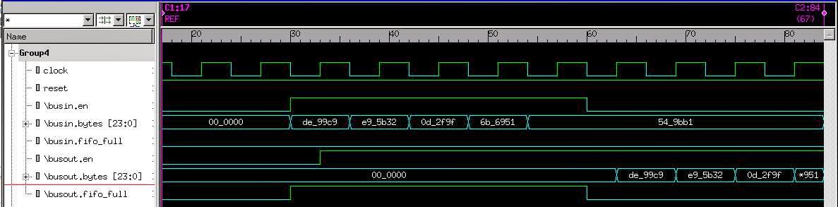 Here is a text and graphical snapshot of the simulation of the Image Buffer. The text shows 4 writes into the FIFO using Bus in (while reads are blocked on Bus out) and then the 4 writes are read on Bus out while blocking writes on Bus in.